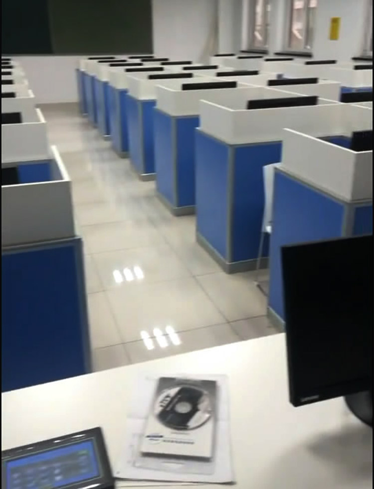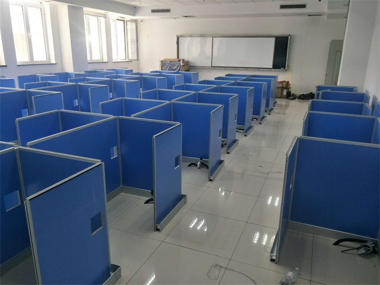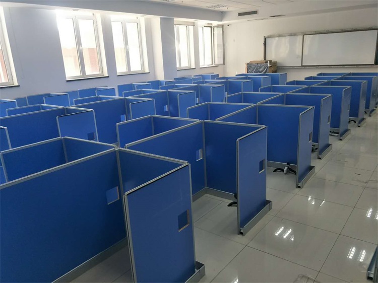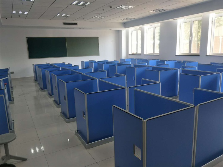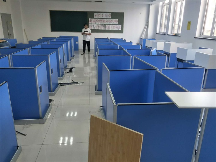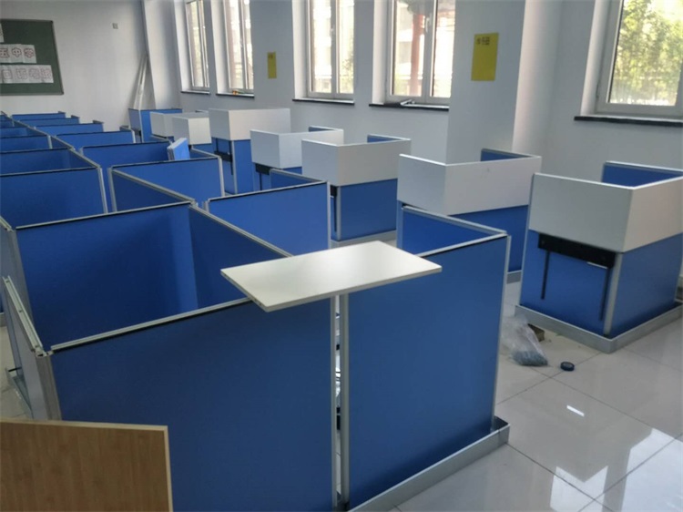 根據北京市第五十五中學升降屏風多媒體教室的使用需求,本次教室設計了一套采用智能升降屏風桌,每個座位都有可升降的屏風,考試時屏風升起后可有效的隔斷相鄰人的正常視線,防噪音效果,可達到互不干擾的作用,平時上課時屏風降下,和普通的教室無異,滿足一教室多用的需求。