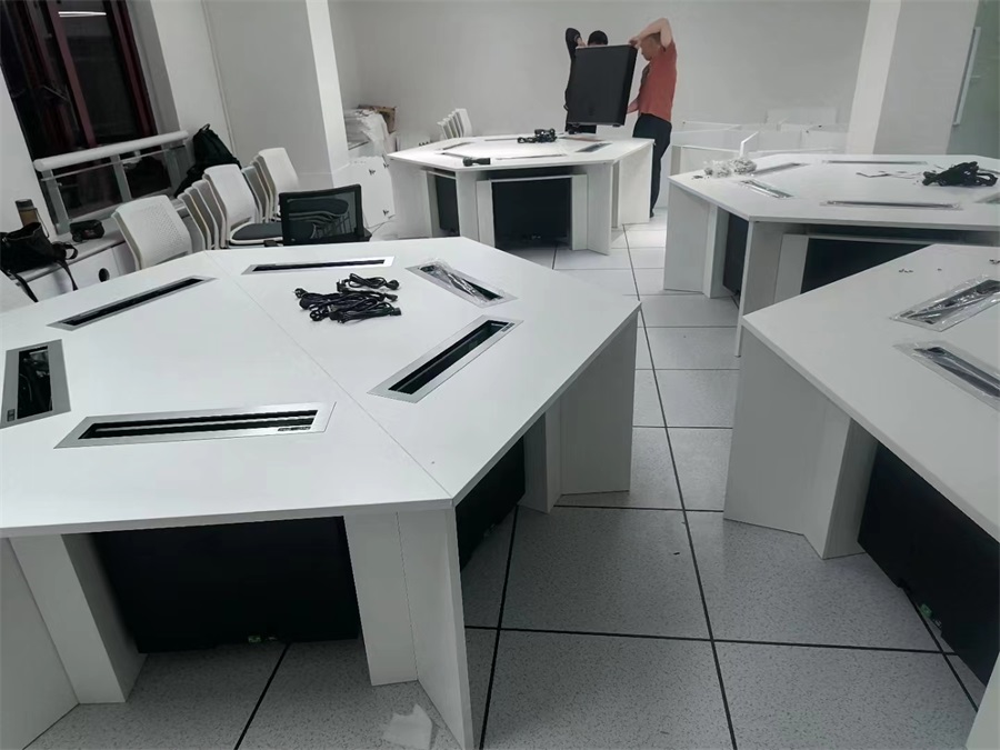 為該學(xué)校的計(jì)算機(jī)教室,設(shè)計(jì)了一套帶液晶屏升降器的六角電腦桌,需要使用顯示屏?xí)r,隱藏在桌子內(nèi)部的液晶升降器把顯示屏從桌子下面升出桌子上面;當(dāng)不使用顯示屏?xí)r,液晶屏升降器自動(dòng)下降,顯示屏隱藏在桌子內(nèi)部,起到防盜、防塵作用,保持桌子表面的平整和美觀,實(shí)現(xiàn)了一室多用。