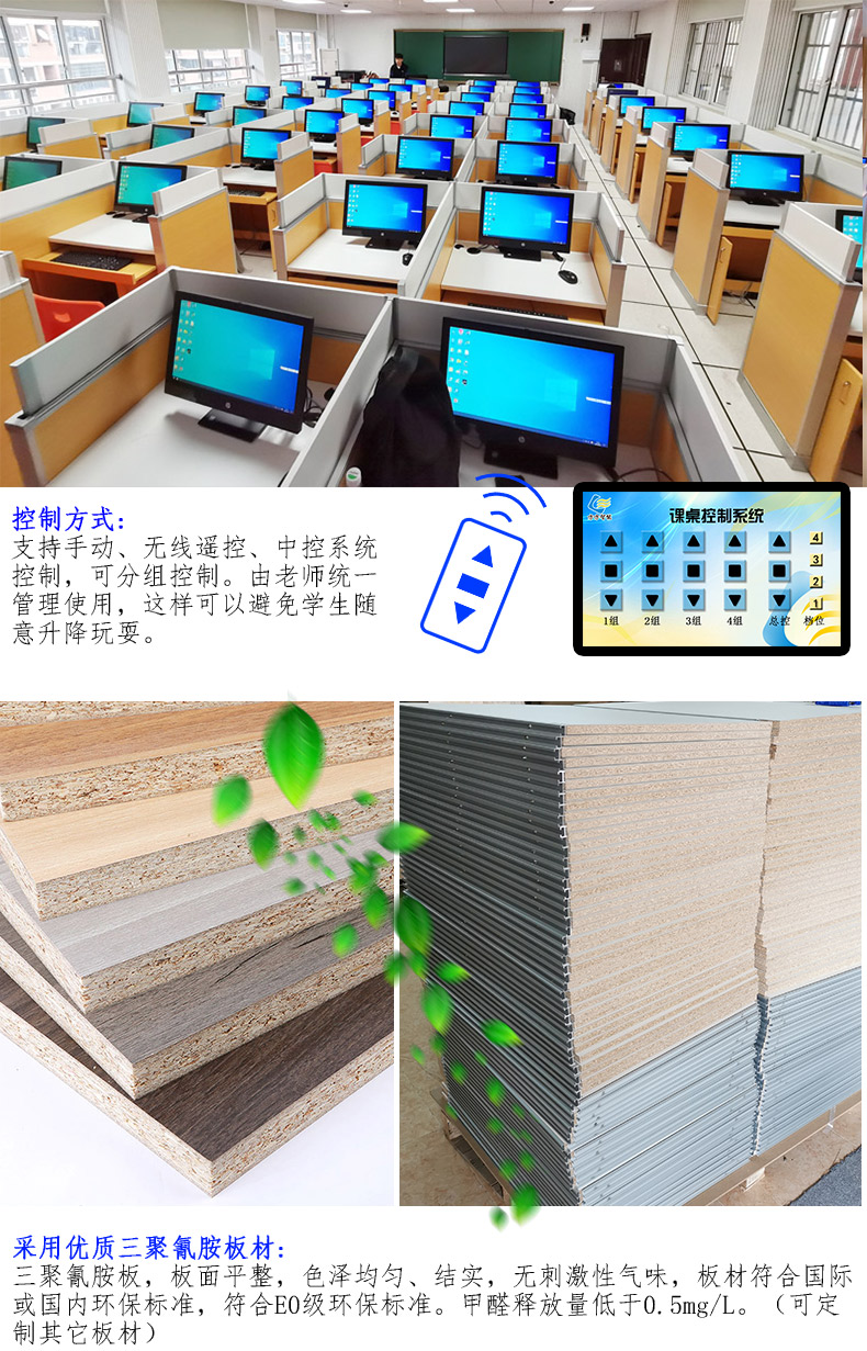 2、桌體及升降板采用15-16mm三聚氰胺板,桌面采用25mm厚三聚氰胺板材(可定制桌面貼防火板飾面,邊緣做鴨嘴邊造型)。色澤均勻,板面結實、無刺激性氣味,板材優于國家及相關行業環保標準。*提供生產廠家符合GB18580-2017《室內裝飾裝修材料人造板及其制品中甲醛釋放限量》板材檢測報告。