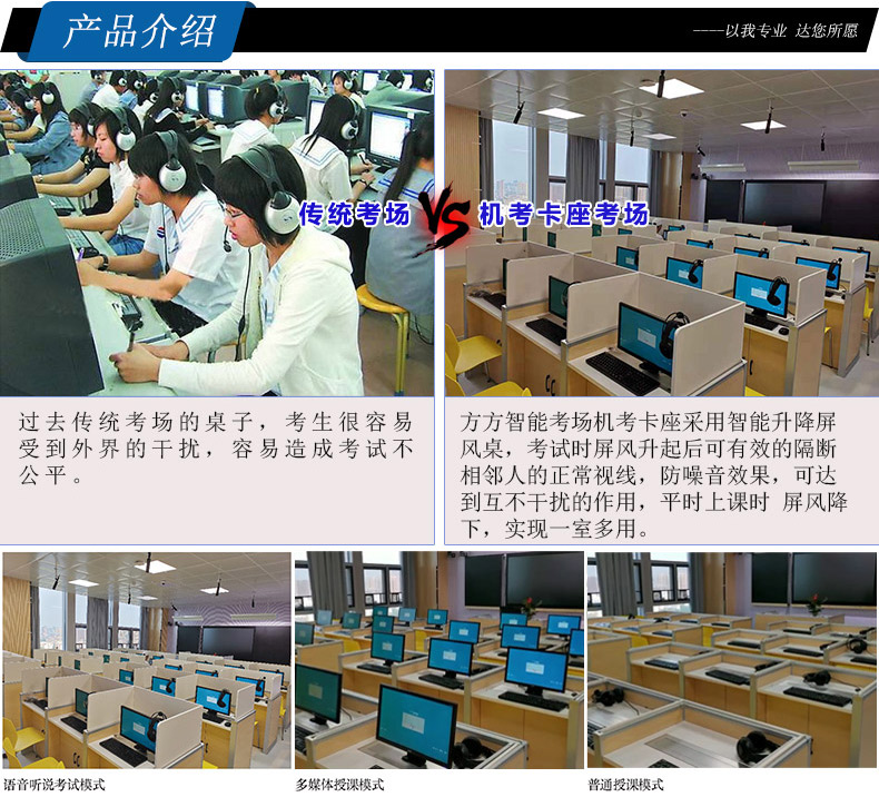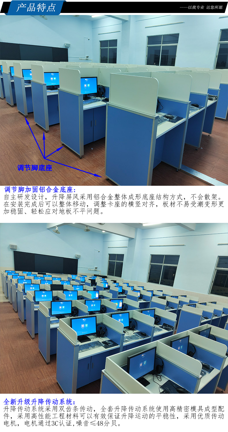 1、*升降屏風(fēng)基礎(chǔ)高度880mm、桌面高750mm,屏風(fēng)考試時升起高度1230mm。形成獨立空間,起到良好的隔音隔斷效果,確保能最大程度降低相鄰學(xué)生之間考試時的互相干擾和影響.