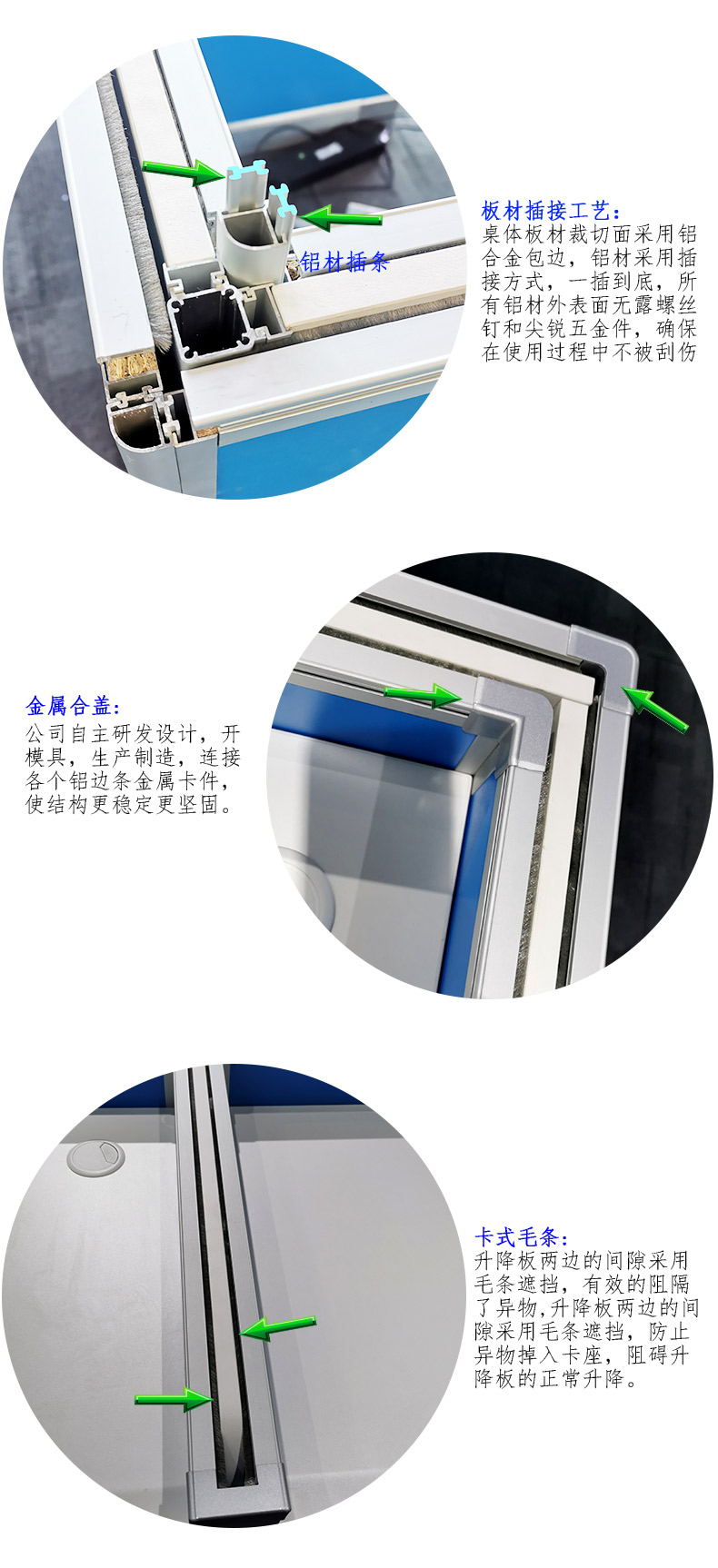 4、*升降屏風(fēng)采用一體成形鋁合金型材整體包邊,安裝完成可整體移動,調(diào)整卡座的橫豎對齊,板材不易受潮變形更加穩(wěn)固;桌體采用鋁材插接方式連接,所有外表不漏螺絲釘或尖銳五金件,確保使用身體不被劃傷。
